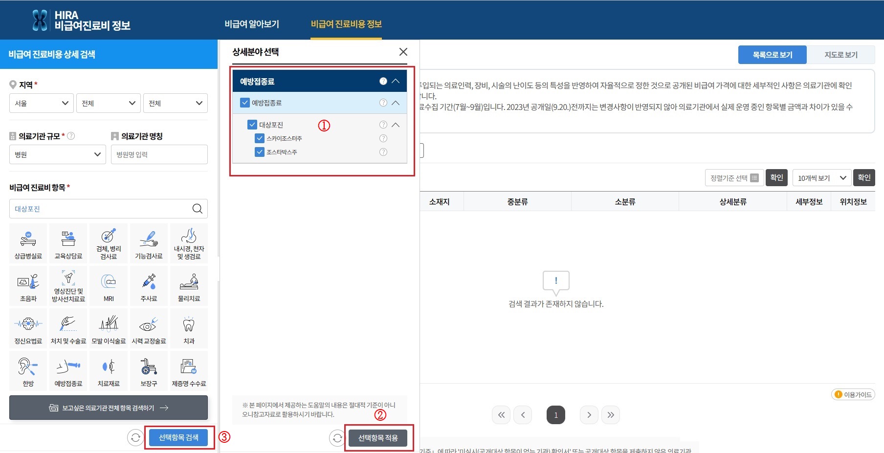 둘째, 1번 검색하고 싶은 해당 백신을 클릭한 후, 2번과 3번을 클릭합니다.